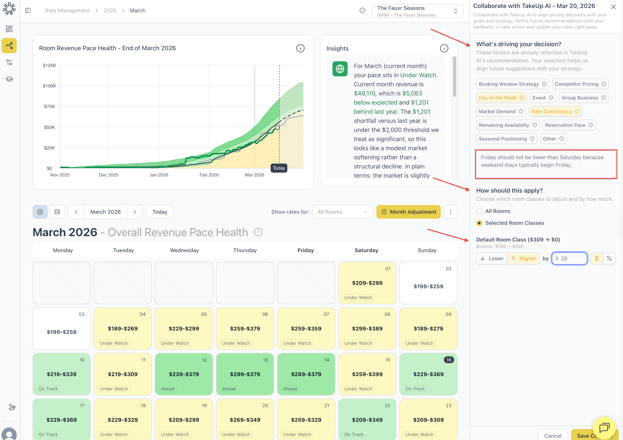 The Collaborate With AI feature allows you to provide feedback to TakeUp’s pricing system so it can learn your unique business preferences.