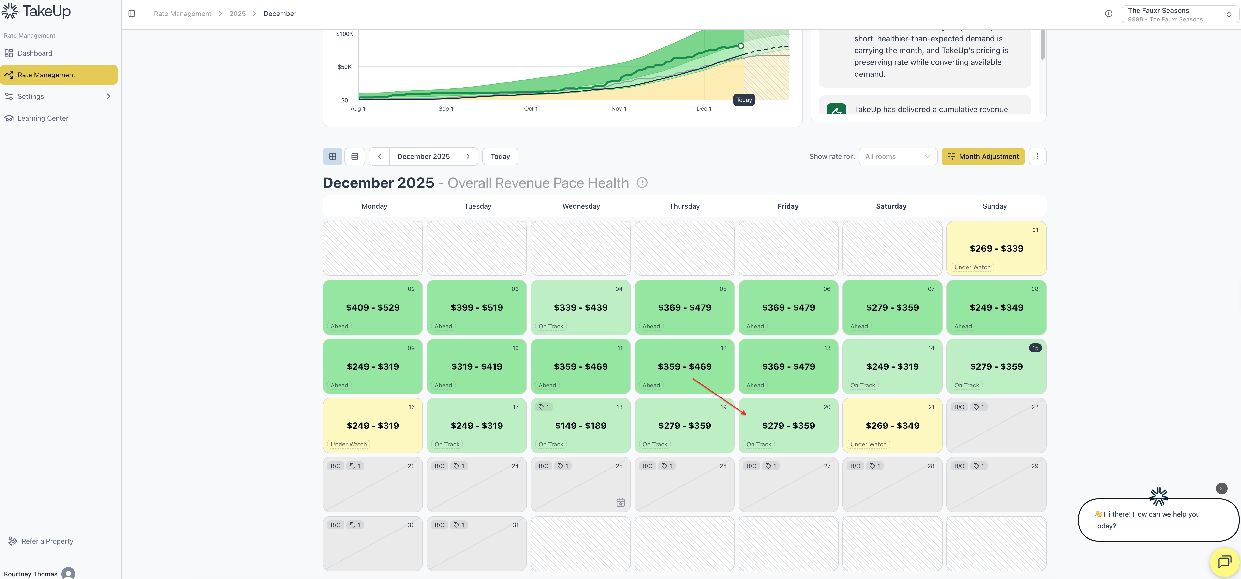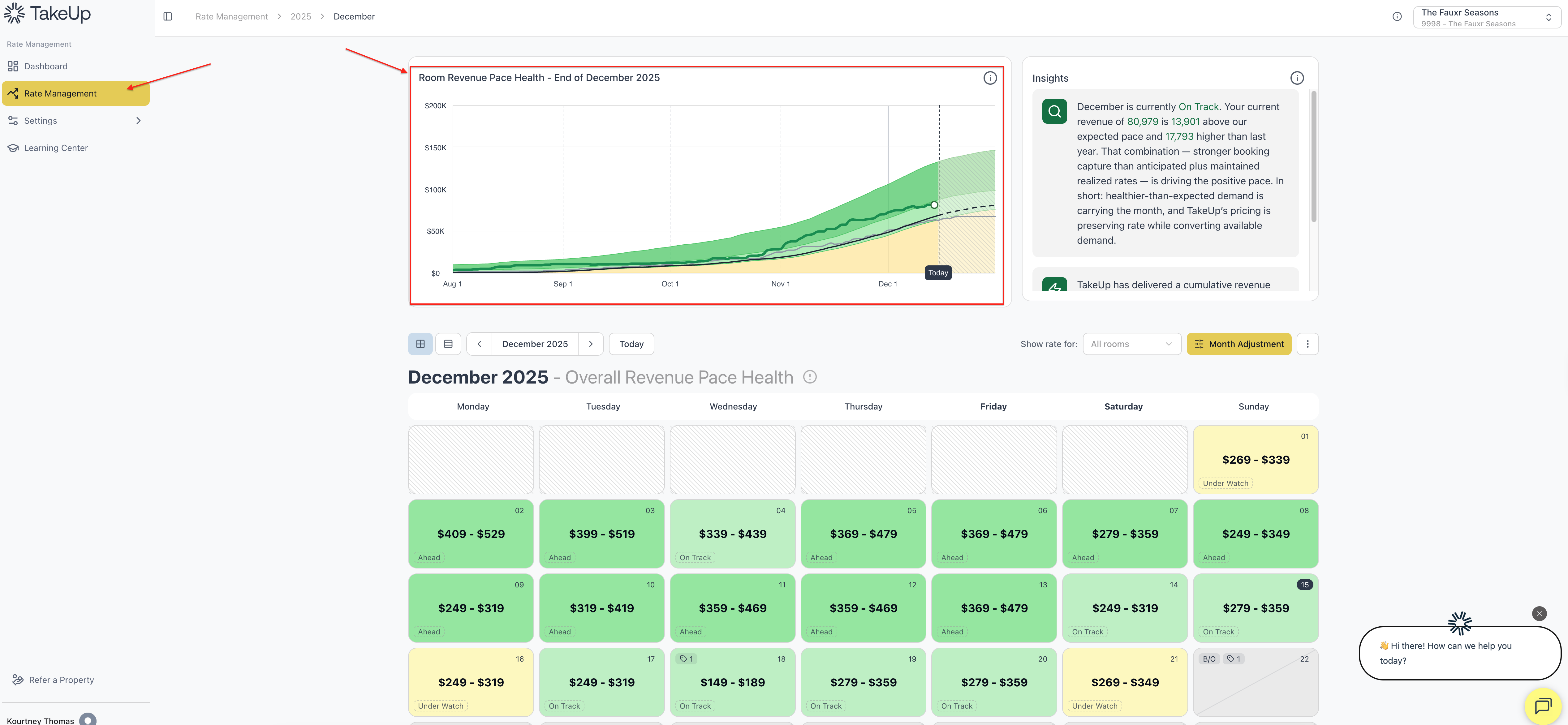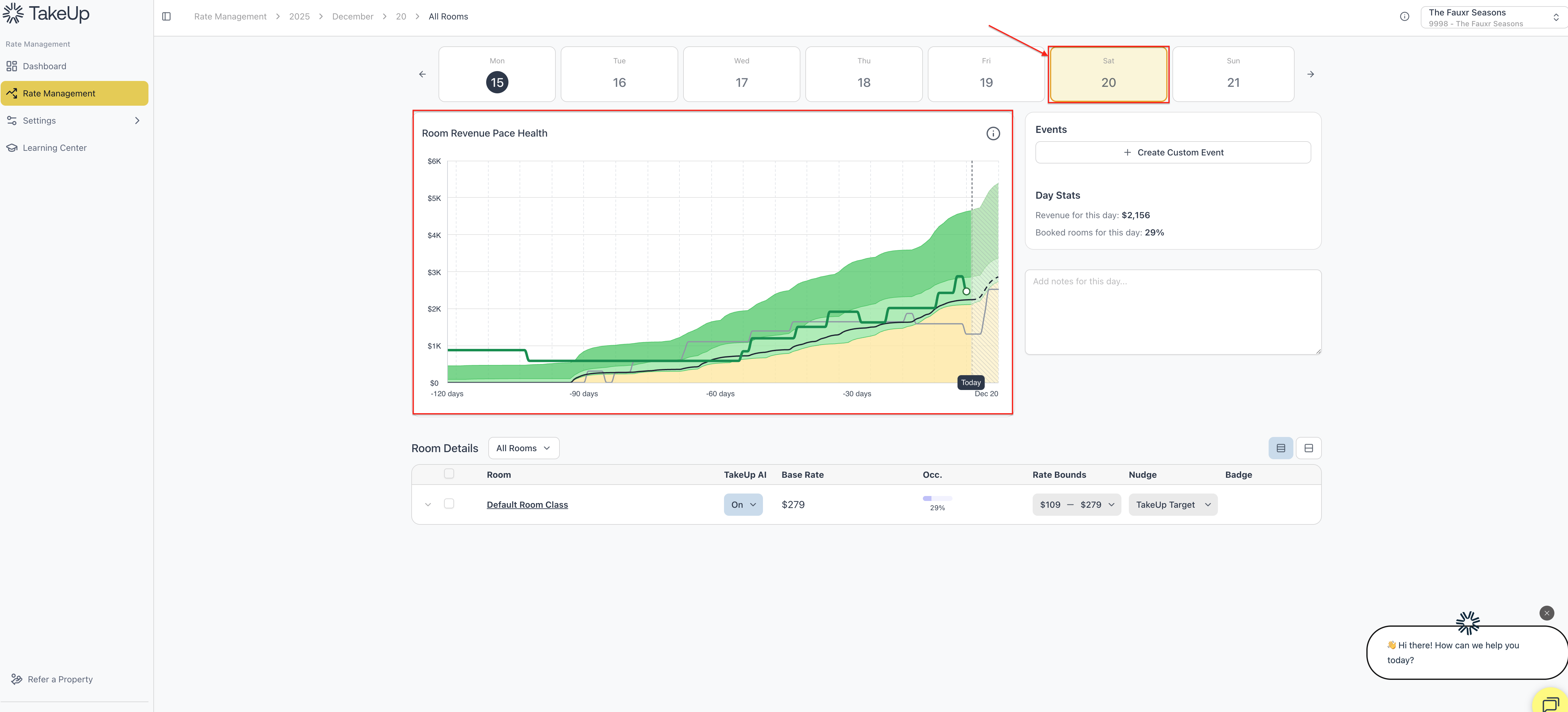 You can find your Room Revenue Pace Health Chart by navigating to Rate Management in the left-hand menu of the TakeUp web app.