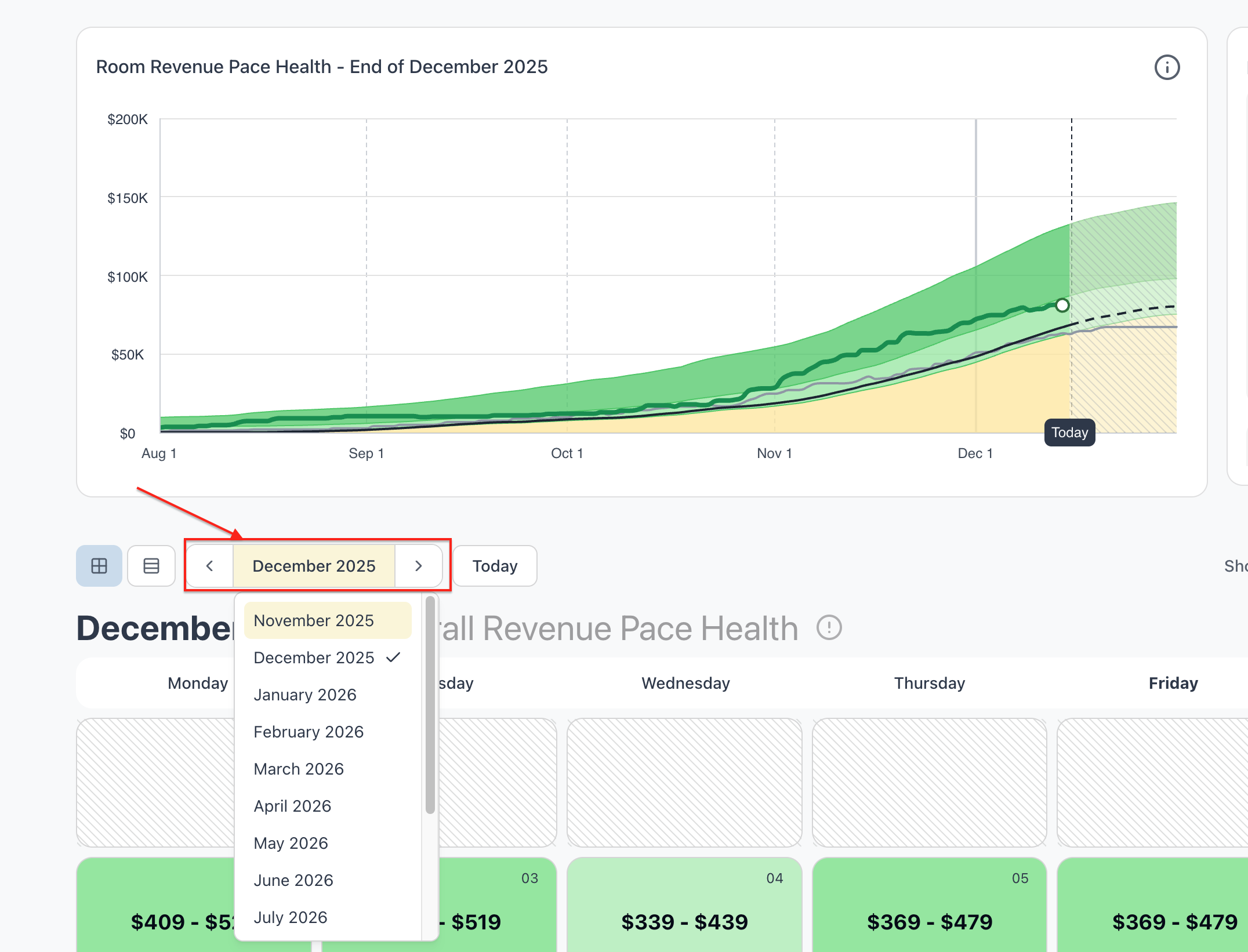 You can view your Room Revenue Pace Health Chart one month previous by using the arrow to the left of th emonth, or select future months with the forward arrow.