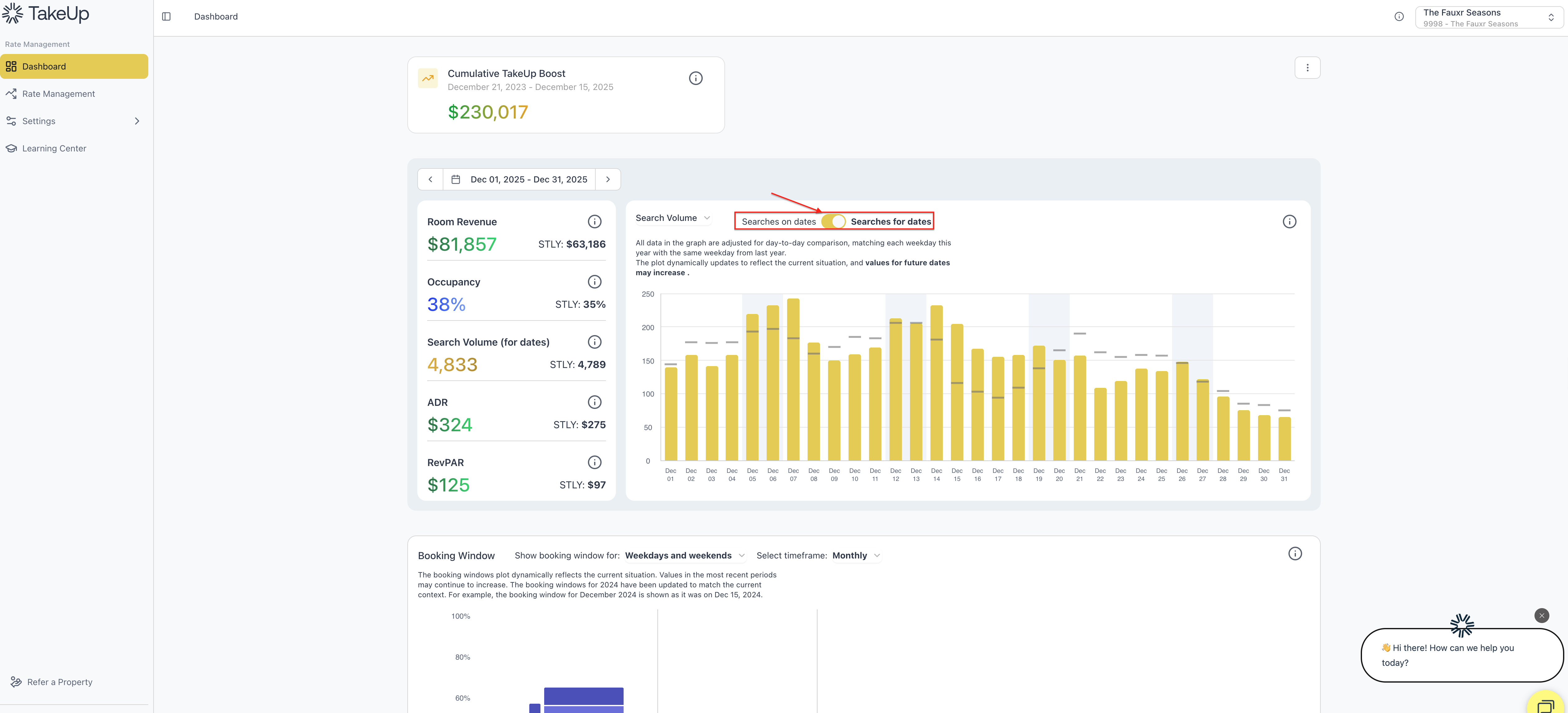 Once your property has been live on TakeUp for a full year, you’ll see Same Time Last Year (STLY) search volume displayed in soft gray.