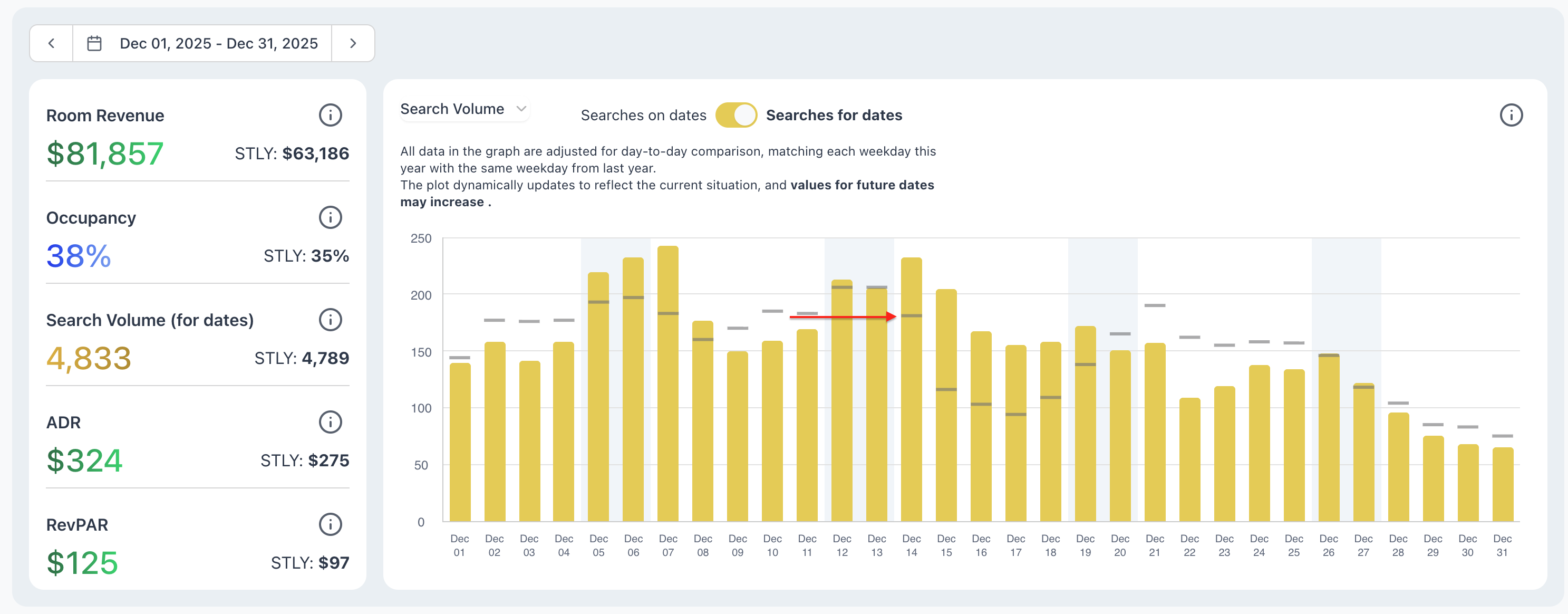 By seeing how guest interest is trending ahead of bookings, Search Volume helps you stay informed rather than reacting after pickup has already shifted.