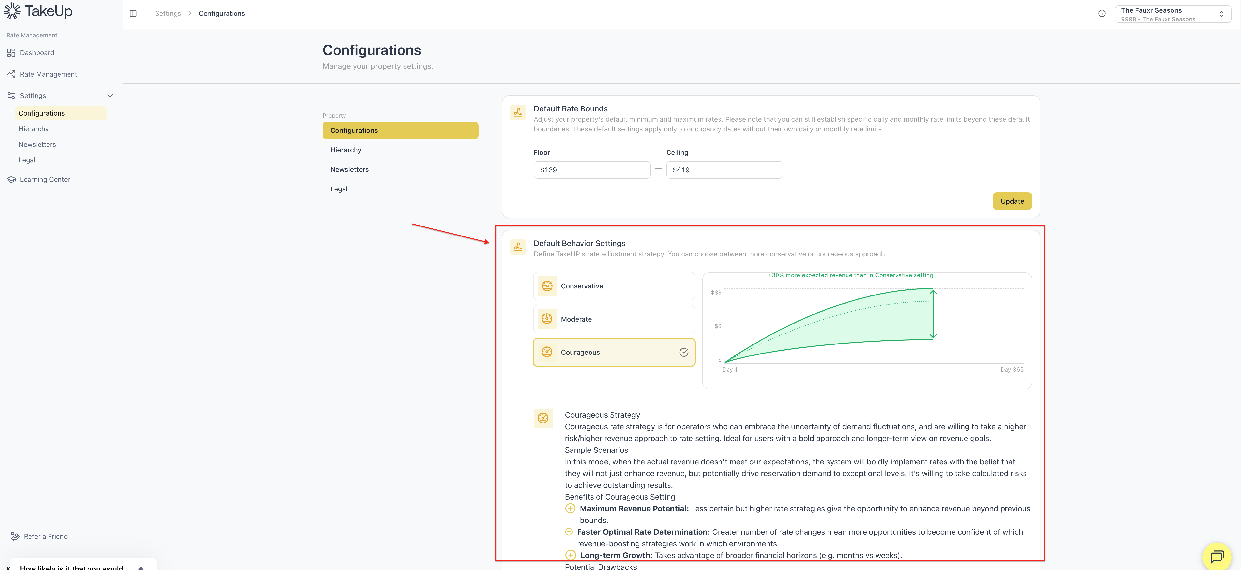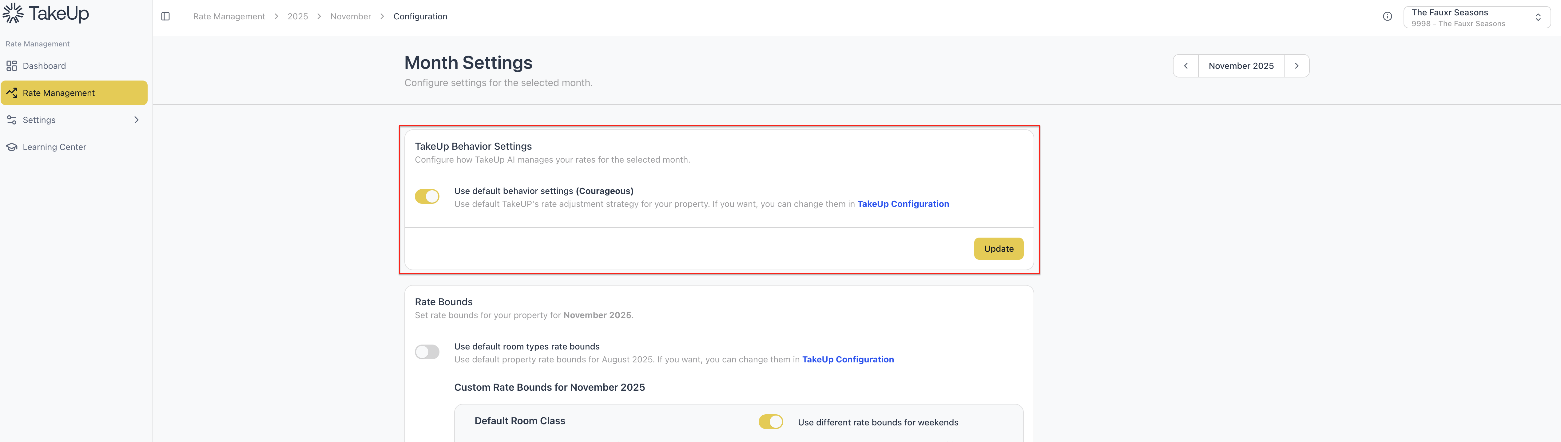 TakeUp's rate Behavior defines TakeUp's rate adjustment strategy. You can choose between a more conservative or courageous approach. TakeUp Behavior can be adjusted at a default (year-round) level or at the monthly level.