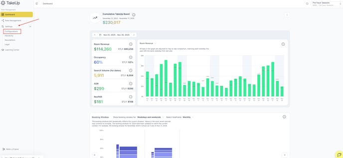 Your property's default rate Behavior can be found by navigating to the "Settings" tab in the control panel on the left side of the web app and selecting "TakeUp Configuration."