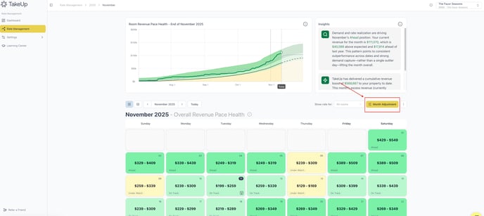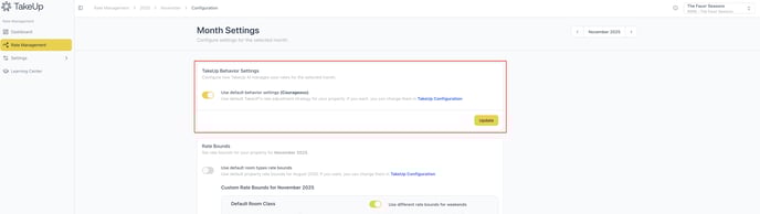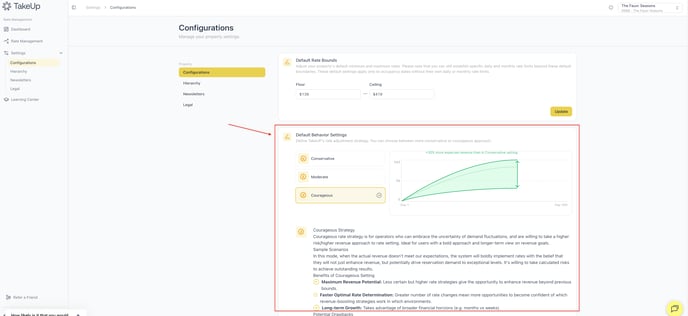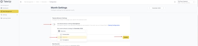 TakeUp's rate Behavior defines TakeUp's rate adjustment strategy. You can choose between a more conservative or courageous approach. TakeUp Behavior can be adjusted at a default (year-round) level or at the monthly level.