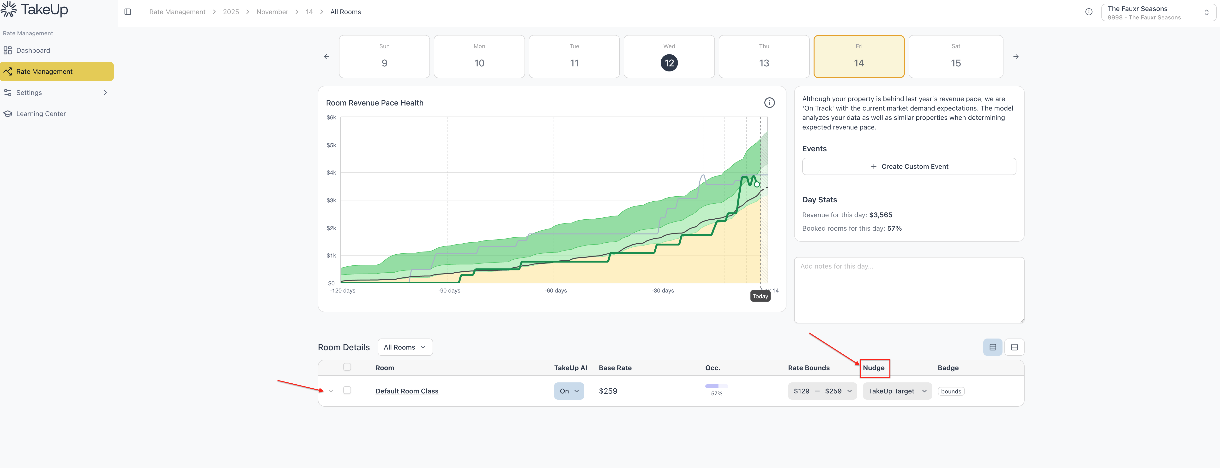 To use the nudge feature, navigate to the Rate Management page and click on the day you are interested in on the calendar.